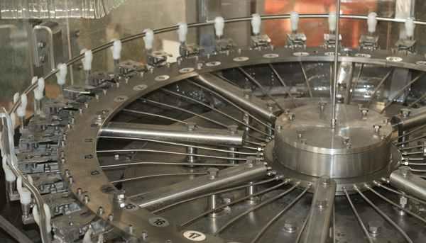 瓶装纯净水灌装机瓶子由矿泉水流水线风送道传送,随后根据拨瓶星轮传送至三合一机的冲瓶机。冲瓶机旋转盘上配有瓶夹,瓶夹夹住瓶口沿一导轨旋转180°,使瓶口朝下。在冲